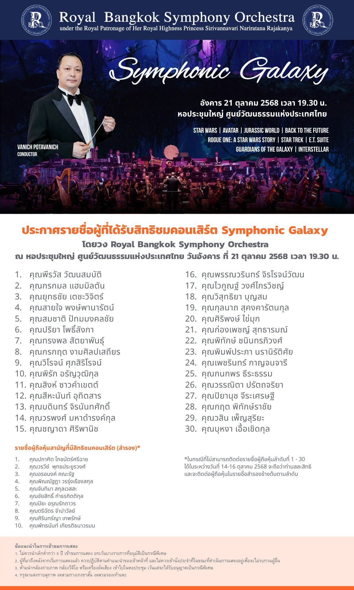 Complimentary tickets to world-class concerts by the Royal Bangkok Symphony Orchestra under the patronage of Her Royal Highness Princess Sirivannavari Nariratana Rajakanya.