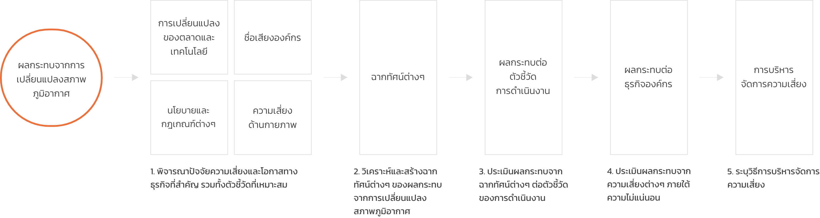 เราพิจารณาเลือกความเสี่ยงด้านกายภาพที่มีผลกระทบต่อธุรกิจอย่างมีนัยสำคัญ สำหรับการวิเคราะห์เหตุการณ์และแนวโน้มที่อาจเกิดขึ้นผ่านฉากทัศน์ต่าง ๆ เพื่อยืนยันว่ากลยุทธ์ด้านการเปลี่ยนแปลงสภาพภูมิอากาศมีความยืดหยุ่นและสามารถตอบสนองต่อเหตุการณ์ต่าง ๆ ได้อย่างเหมาะสม เราระบุความเสี่ยงด้านกายภาพตามตำแหน่งที่ตั้งของโรงไฟฟ้าและสำนักงาน โดยมีวิธีการดำเนินงาน 4 ขั้นตอน ดังนี้