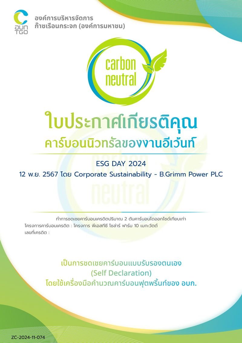 งาน ESG DAY 2024 เป็นการจัดงานแบบ Carbon Neutral Event หรือ งานปลอดคาร์บอน ซึ่งได้รับการรับรองจากองค์การบริหารจัดการก๊าซเรือนกระจก (องค์การมหาชน) โดยจัดขึ้น ณ สำนักงาน ของ บี.กริม เพาเวอร์ ถนนกรุงเทพกรีฑา ในรูปแบบผสมผสาน (Hybrid) โดยมีพนักงานจากหน่วยงานทั้งที่สำนักงานกรุงเทพและโรงไฟฟ้า ให้ความสนใจเข้าร่วมกิจกรรมดังกล่าวเป็นจำนวนมาก ทั้งนี้ กิจกรรมภายในงานประกอบด้วยการบรรยายให้ความรู้เกี่ยวกับการรับมือกับการเปลี่ยนแปลงทางสภาพภูมิอากาศ ในหัวข้อ “Technology Solutions for Net Zero Pathway” และการสนับสนุนหลักเศรษฐกิจหมุนเวียน ในหัวข้อ “Circularity at B.Grimm” โดยผู้บริหารและพนักงาน และกิจกรรม “CG Talk” ที่เปิดโอกาสให้พนักงานบอกเล่าประสบการณ์การทำงานอย่างถูกต้องตามจรรยาบรรณธุรกิจ ตลอดจนกิจกรรมที่ส่งเสริมความรู้ในเรื่องสิ่งแวดล้อม สังคม และธรรมาภิบาล